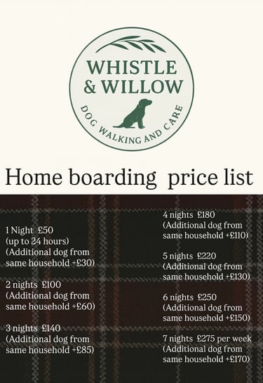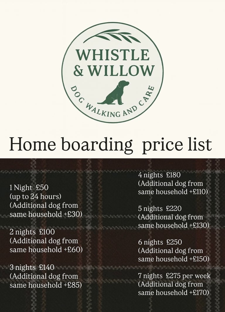 Up to 10 hours (8am-6pm), includes 2 walks (Additional dog from same household +£20)
